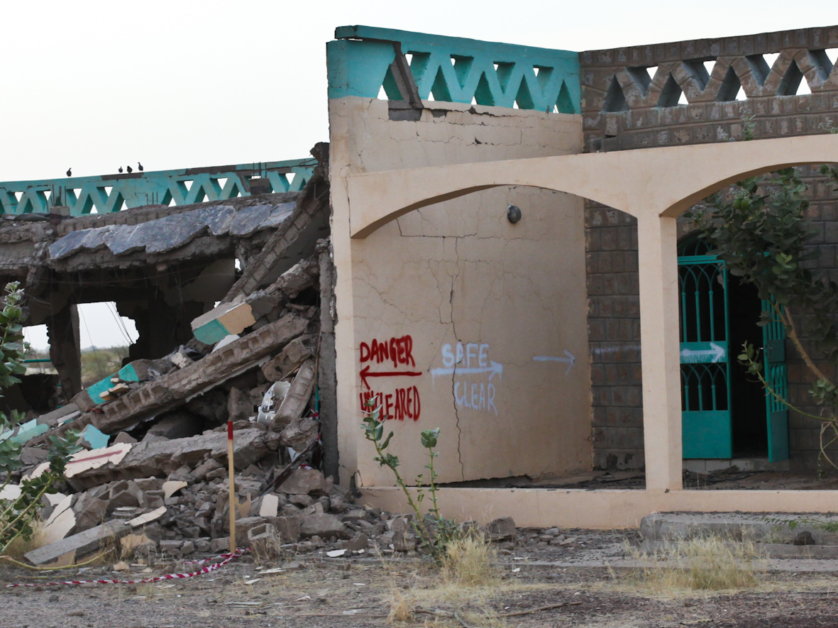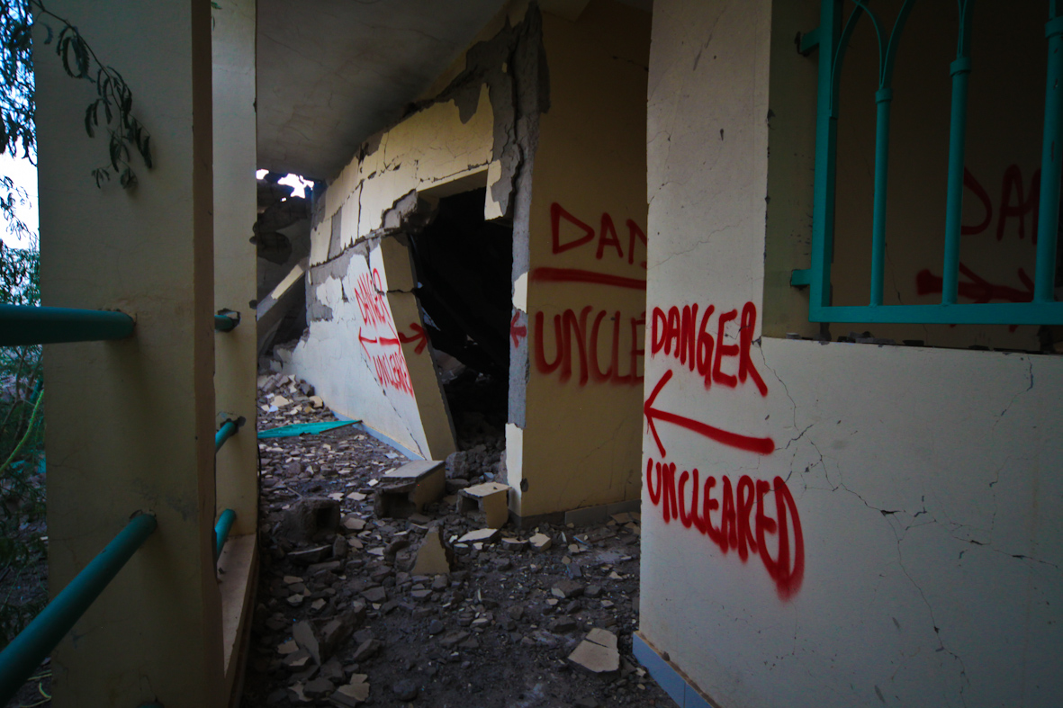 Czerwony napis ostrzegał, że posesja nie została oczyszczona z możliwych materiałów wybuchowych, ale Abu nas uspokoił.