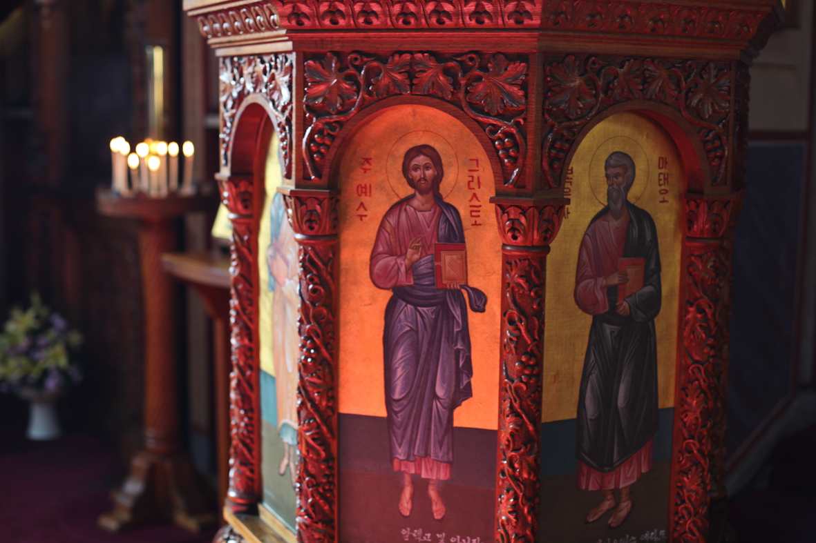 Cerkiew św. Mikołaja w Seulu jest największą prawosławną świątynią w Seulu. Zazwyczaj prowadzone są tu dwie liturgie. Jedna w kaplicy w języku staro-cerkiewno-słowiańskim, druga w katedrze – po koreańsku. Liturgia koreańska sprawowana jest w akompaniamencie organów (wpływ protestancki), a ikony podpisane są w hangulu. Wiernych martwi brak koreańskiej prawosławnej Biblii, ale dla porównania Polski Autokefaliczny Kościół Prawosławny własną liturgiczną edycję wydał dopiero w 2014 roku.