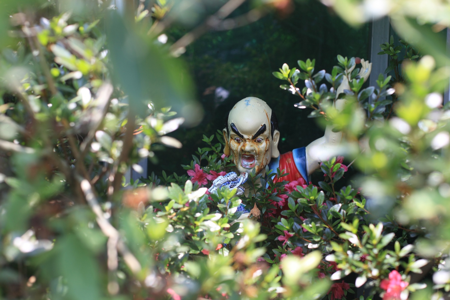 Nic tu nie jest typowe. Bramy świątynnej pilnują dwa potężne białe słonie. Wkracza się jednak nie na przestronny plac, a na dość klaustrofobiczne roślinne ścieżki. Podczas wędrówki zielonym labiryntem z zarośli wyglądają na nas Bodhisattwowie, oświeceni mnisi, demony… Rozmieszczono tu setki figur. Małych i dużych, strasznych i pięknych. Bez większej logiki. Postaci nie są nawet podpisane. Niektóre figury całkiem porósł bluszcz i azalie.